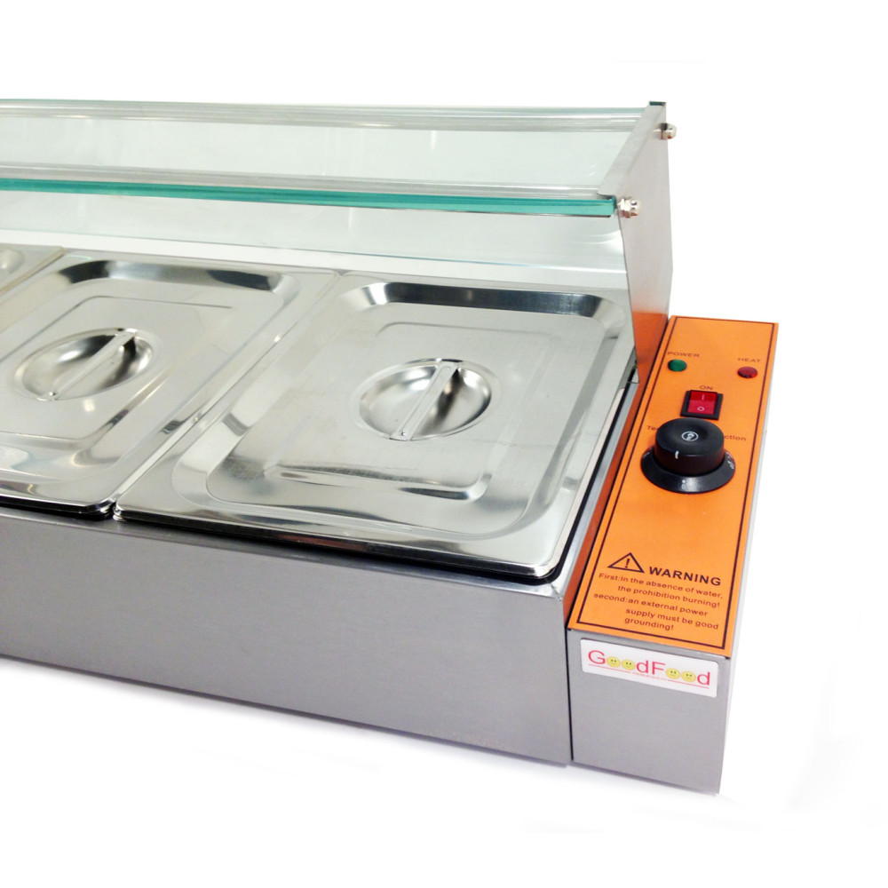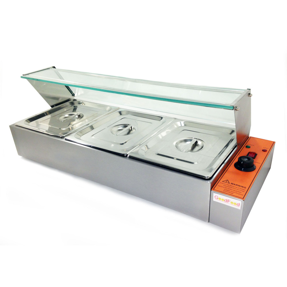 Апарат для підігріву готових страв (марміт) GoodFood BM3G вітрина створений для стабільного утримання температури та привабливої подачі гарячих позицій у форматі відкритої демонстрації. Три гастроємності GN 1/2 х h100 мм забезпечують швидку ротацію страв на роздачі без втрати якості, а автоматичний термостат і регулятор температури +30...+110 град. підтримують точний тепловий режим протягом усього дня.