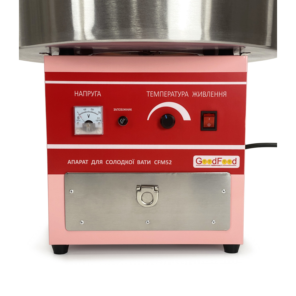 Регульована температура дозволяє працювати з різними видами цукру та ароматизаторів, зберігаючи стабільну текстуру вати у спеку та прохолоду. Потужність 0,98 кВт забезпечує оперативний вихід на робочу температуру від звичайної мережі 220 В — без вимог до спеціальної проводки. Нержавіюча чаша 520 мм тримає чистоту й гігієну, а гладка поверхня легко миється між змінами. Настільний формат спрощує монтаж на кіоску, барній стійці чи у фудтраку, а ваги 10,5 кг достатньо для впевненої стійкості і водночас мобільності. GoodFood CFM52 — практичний інструмент із зрозумілою експлуатацією, що швидко окупається завдяки емоційному попиту на солодку вату і низькій собівартості порції.