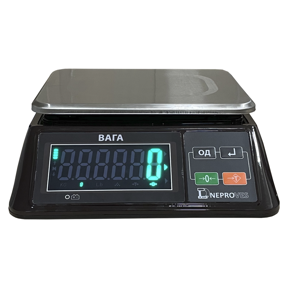 Фасувальні ваги Днепровес ВТД-ФЛ 6кг створені для швидкого та точного фасування в торгівлі та на виробництві. Великий зелений LED дисплей з висотою символів 42 мм читається з першого погляду, навіть у холодних приміщеннях або за яскравого освітлення. Захищена кнопка ввімкнення і роз’єм заряджання, великі клавіші та режим поштучного зважування роблять роботу інтуїтивною та стабільною щодня.