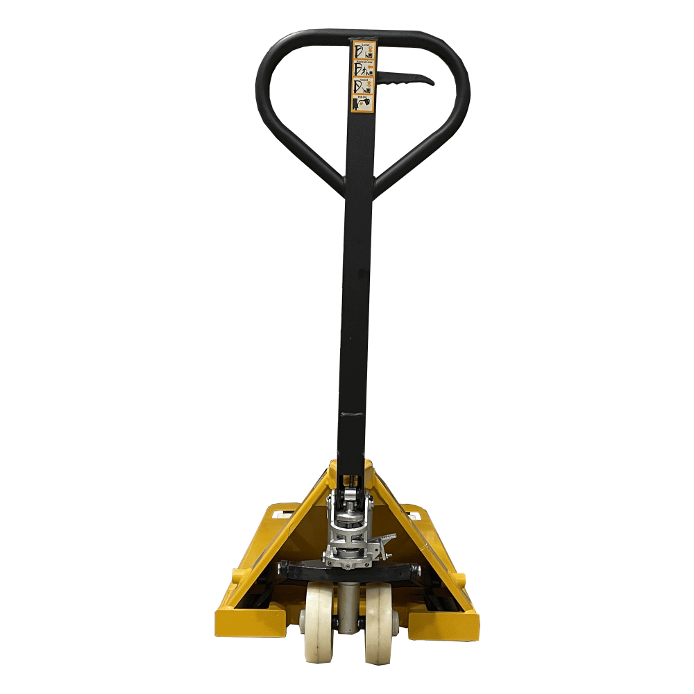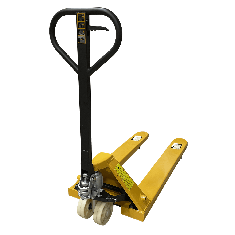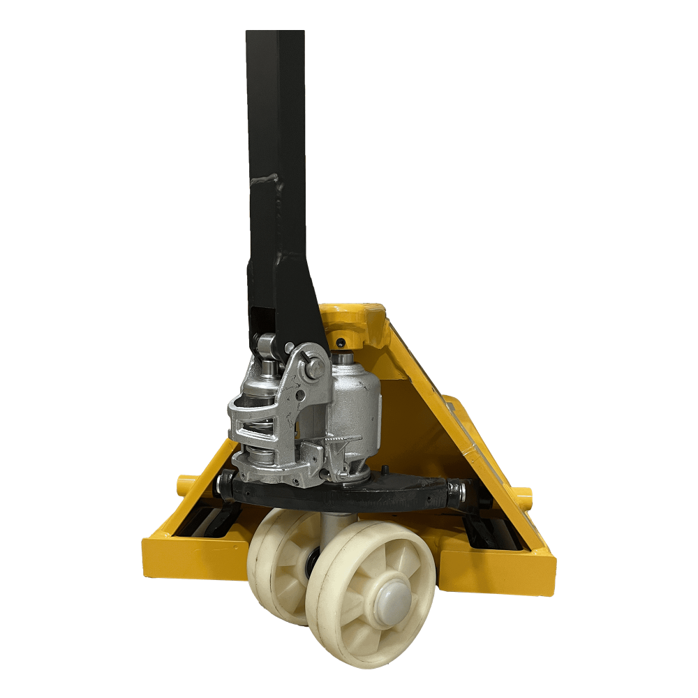 Формат 550×1150 мм ідеально працює з європіддоном 1200×800, забезпечуючи швидке захоплення та стабільне транспортування. Насос типу А відомий надійністю та простотою обслуговування, а отже — мінімальні витрати на сервіс і максимальний ресурс у щоденних змінах. Маса 55 кг спрощує керування візком, розворот і точне позиціонування біля стелажів. Пара рульових коліс 150×50 мм і роликів 60×60 мм допомагає долати нерівності підлоги та пороги рамп без зайвих зусиль.