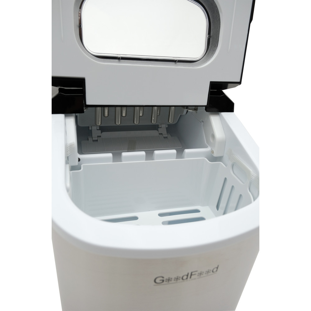 Льодогенератор GoodFood IM12FS STEEL забезпечує цілодобовий потік льоду без підключення до водопроводу. Пальчиковий пустотілий лід з двома розмірами формується по 9 шт за цикл, а продуктивність сягає 12 кг льоду на добу. Кожен шматочок важить 8-10 г — оптимально для коктейлів, кавових напоїв, вітрин з напоями та швидкого охолодження інгредієнтів. Корпус з неіржавної сталі стійкий до корозії і легко миється, настільне виконання економить простір, а повітряне охолодження підвищує надійність щоденної роботи.