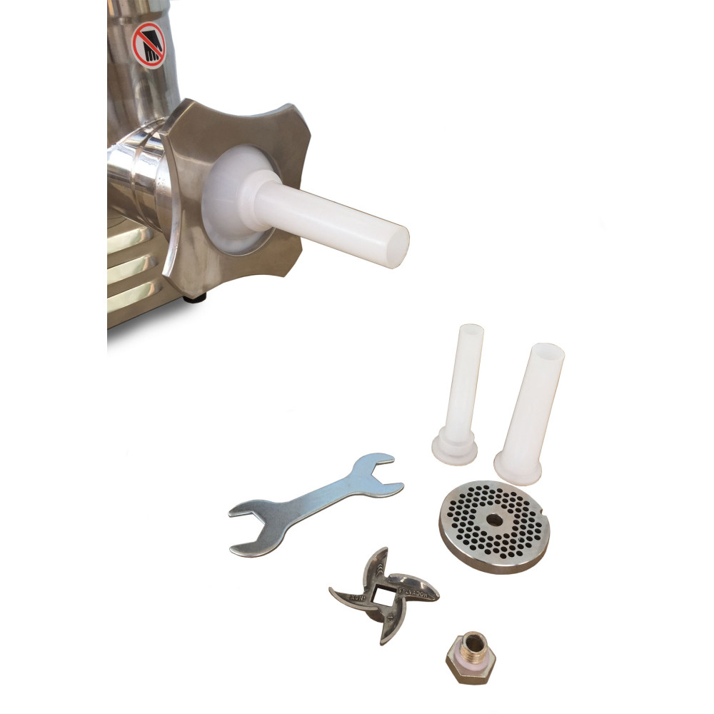 Потужний вентильований двигун 750 Вт витримує високі навантаження без перегріву, а дві системи захисту бережуть електрику та вузли від збоїв. Полірована харчова нержавіюча сталь не вбирає запахів і швидко відмивається — це чистота процесу і довговічність ресурсних деталей. Реверс миттєво звільняє шнек від жил — менше простоїв, більше готового фаршу за зміну. Система Enterprise — стандарт, з яким легко підібрати додаткові ножі й ґратки під потрібну текстуру. Настільний формат з габаритами 450x240x320 мм і вагою 27 кг забезпечує стійкість без болтів та складного монтажу. Комплект насадок 16/19/22 мм розширює меню: від соковитих ковбас до дрібного перетирання для паштетів. З офіційною гарантією 12 місяців ви отримуєте захищену інвестицію та прогнозований результат.