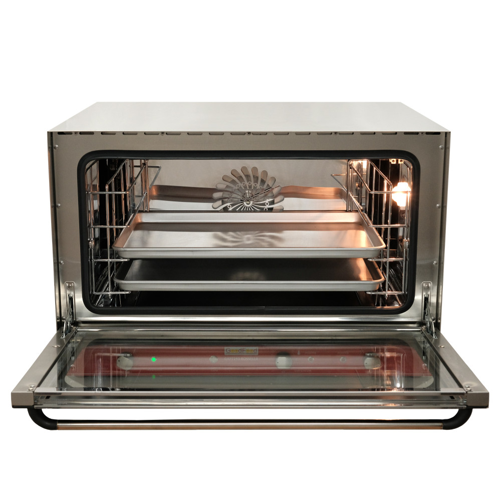 Висока віддача з першої партії: піч швидко виходить на режим 50-300 град С, тож випічка пропікається рівномірно, а м’ясо та овочі залишаються соковитими завдяки пару. Функції гриля додають ефектної, рум’яної скоринки без пересушування. Формат 600х400 мм універсальний для більшості деків та заготовок, а 4 рівні дозволяють гнучко планувати виробництво впродовж усього дня. Електро-підключення 220В / 50Гц. та потужність 6,2 кВт забезпечують простий запуск без складних інженерних робіт. Таймер на 60 хв звільняє увагу персоналу, мінімізуючи людський фактор і брак. Компактні габарити 840х730х570 мм і продумана ергономіка спрощують розміщення навіть на щільних кухнях. Вага 66 кг додає стабільності на робочій поверхні, а транспортна вага 72 кг зручна для доставки та монтажу.