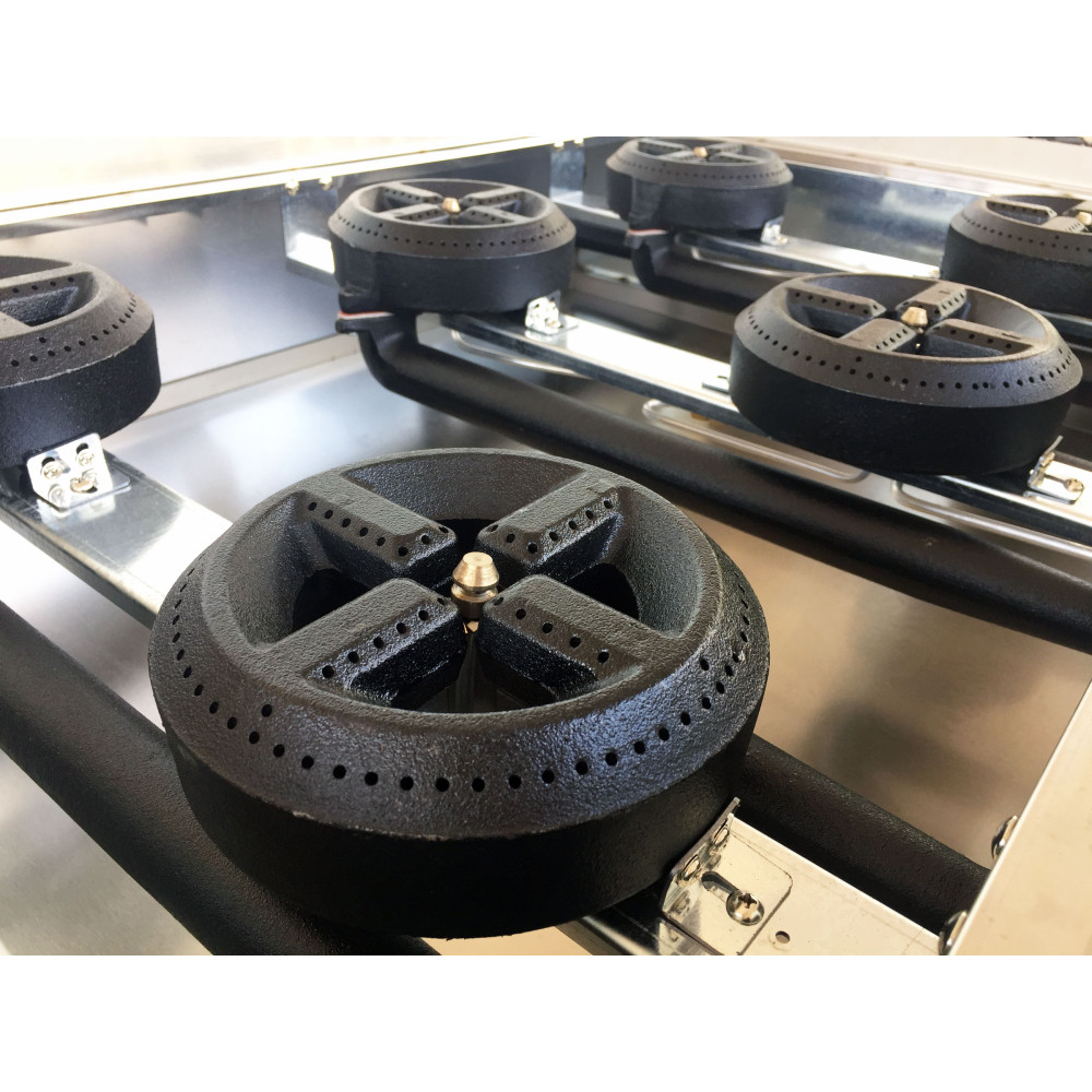 Висока продуктивність без перегріву: 6 пальників діаметром 156 мм рівномірно прогрівають посуд від сотейників до великих каструль, тримаючи стабільне полум’я протягом усього циклу приготування. Надійність професійного рівня: чавунні решітки та латунні вузли витримують інтенсивну експлуатацію, не бояться термоударів і легко чистяться. Раціональна ергономіка: настільний формат дозволяє розмістити обладнання в обмежених зонах кухні, лініях видачі або фудтраках, зберігаючи повноцінний доступ до всіх конфорок.