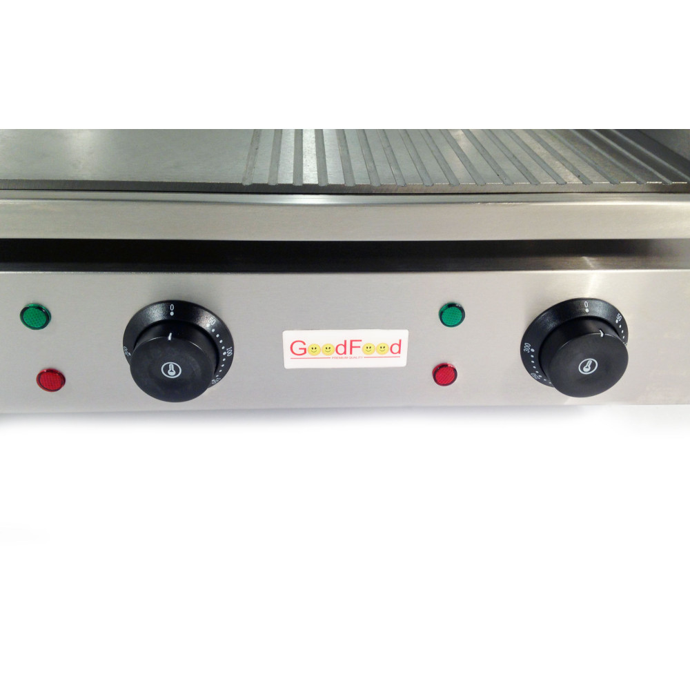 Поверхня для смаження комбінована GoodFood EG73FR створена для стабільної швидкої подачі страв без черг і втрати якості. Комбінована робоча зона поєднує гладку та рифлену частини, тож ви одночасно підсмажуєте овочі, яйця, рибу та робите апетитні смуги на м’ясі або бургерах. Дві незалежні зони нагріву з діапазоном 50–300 °C дають точний контроль і відмінний результат з першої партії.