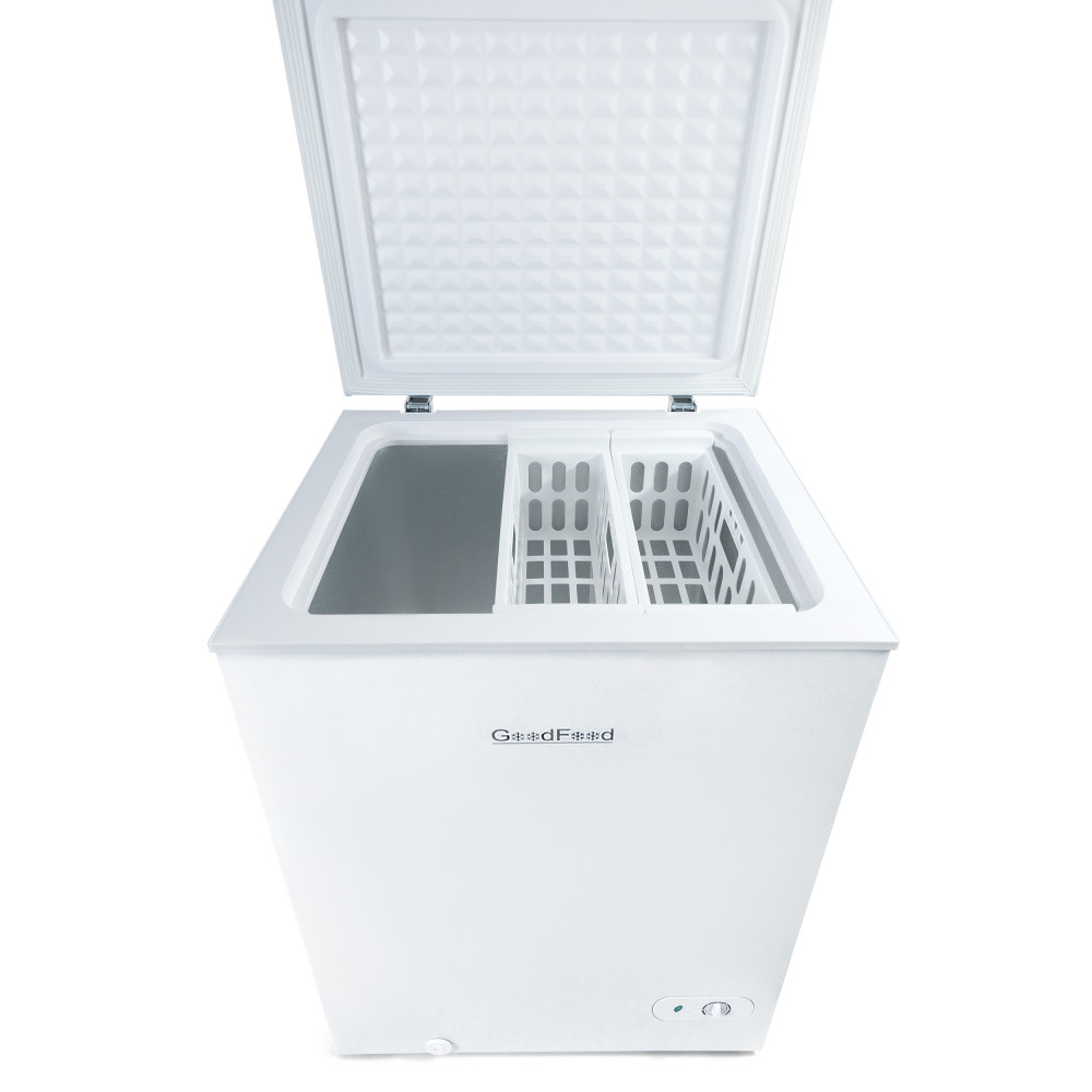 Скриня морозильна GoodFood GF-CF150 WHITE створена для надійного довгострокового зберігання заморожених продуктів без перепадів температури. 150 л корисного об’єму, стабільний температурний режим -18…-22 °C та продумана організація простору з двома кошиками допомагають швидко навести порядок у запасах і зменшити списання.