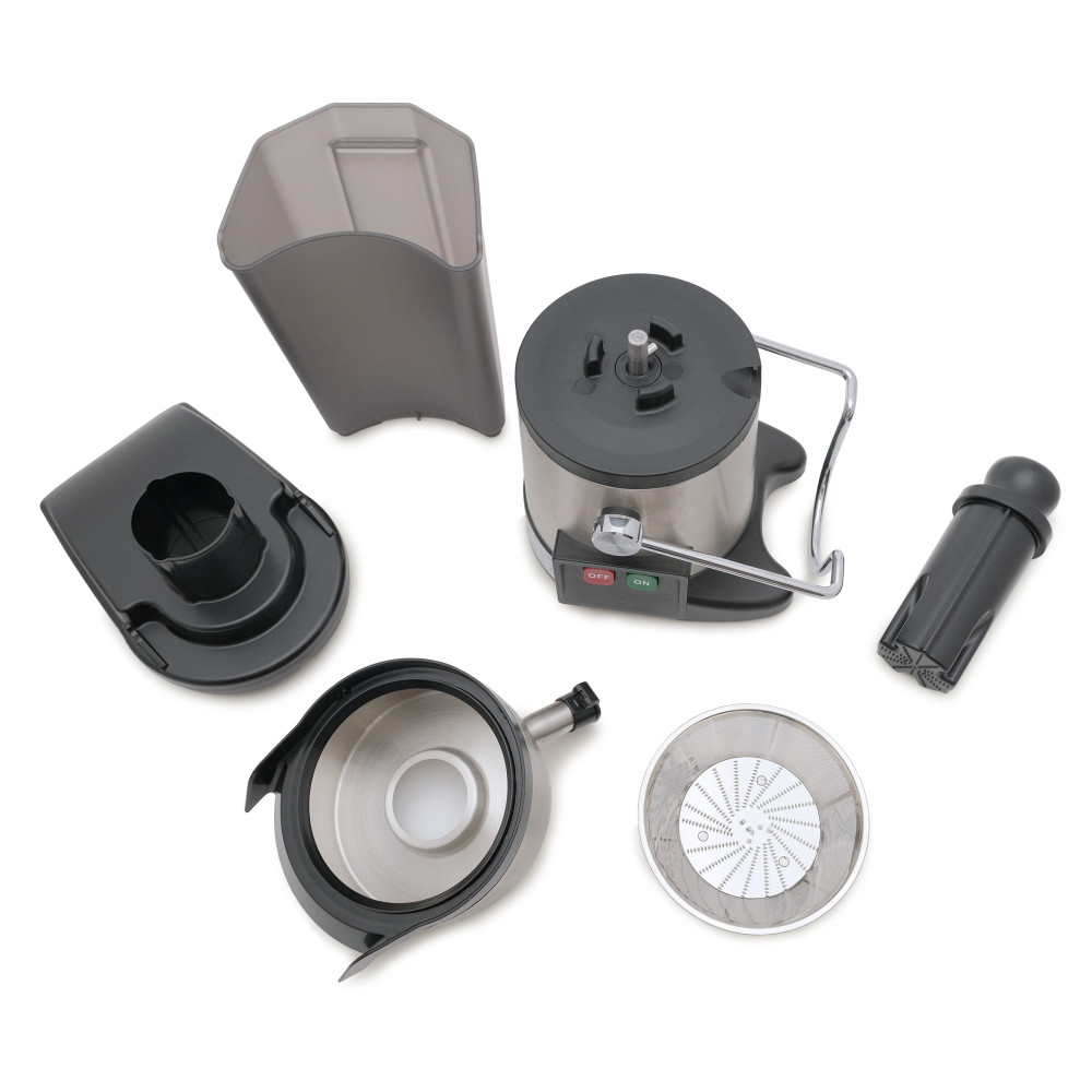 Надійний корпус із неіржавної сталі витримує інтенсивне навантаження та легко миється — менше простоїв, більше сервісу клієнтам. ABS-елементи не вбирають запахи й спрощують гігієнічне очищення після змін. Швидкість 3000 об/хв допомагає швидко опрацьовувати тверді інгредієнти, підтримуючи стабільну якість соку протягом дня. Настільний формат економить простір на барній станції або в цеху, а вага 9 кг додає стійкості під час роботи зі щільними продуктами. Конструкція з окремим бункером для відходів полегшує безперервний цикл: завантаження — віджим — очищення, без хаосу на робочій поверхні.