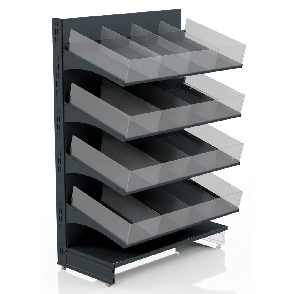 Стелаж для кондитерських виробів має високу міцність і стійкість до зносу завдяки якісному металевому каркасу та порошковому покриттю, що захищає від корозії. Нахилені полиці забезпечують чудову видимість товару й створюють ефект заповненості навіть при частковій викладці. Проста збірка дозволяє встановити обладнання без спеціальних інструментів, а модульна конструкція — підлаштувати під потреби магазину.