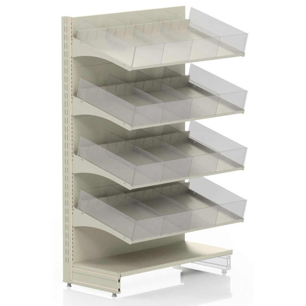 Металеві кондитерські стелажі для правильної організації, сортування та зберігання солодощів, розділені на окремі секції та контейнери. Полиці нахилені під кутом, завдяки чому клієнти добре бачать весь товар, а продавець має до нього швидкий доступ. Також завдяки похилим полицям, товар опускається до переднього краю секції при її спустошенні по мірі продажу, за рахунок чого створюється видимість наповненості. Крім цукерок та печива, таке обладнання підходить для викладання фасованих або розсипних спецій, круп та іншої подібної продукції.