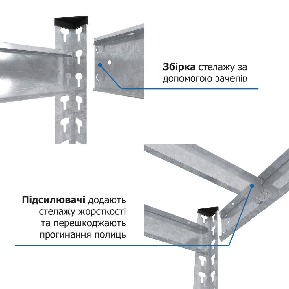 - Висока вантажопідйомність: 300 кг на полицю дозволяє розміщувати коробки, комплектуючі, інструмент, фасовані товари.