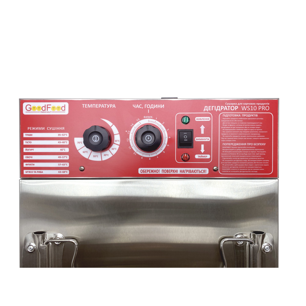 Сушарка промислова для харчових продуктів (дегідратор) GoodFood WS10 PRO створена для стабільного, гігієнічного й контрольованого сушіння продукції без втрати якості. Професійна модель допомагає швидко вивести на ринок ягоди, чіпси з фруктів та овочів, трави, м’ясні та рибні снеки з прогнозованим результатом партії за партією.