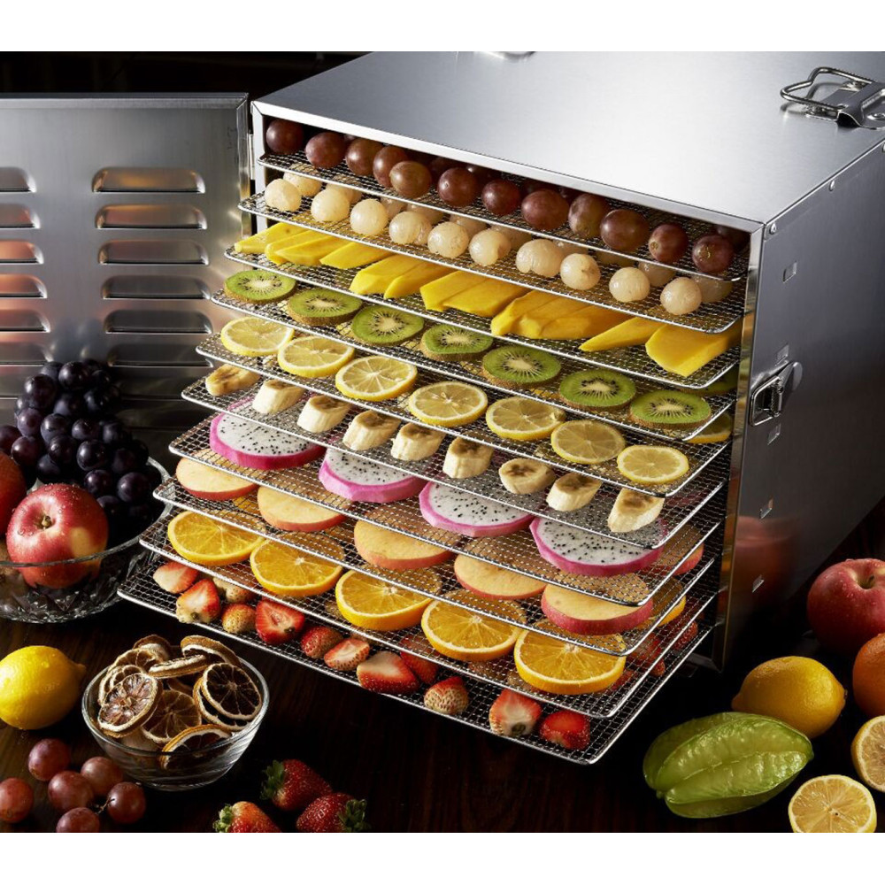 Рівномірний горизонтальний потік повітря забезпечує однаковий результат на всіх 10 полицях — без пересушених країв і сирих зон. Нержавіюча сталь витримує інтенсивні мийки, не вбирає запахів і відповідає вимогам харчової безпеки. Потужність 1 кВт дає економне споживання та стабільну продуктивність протягом тривалих циклів. Діапазон 35–75 °C дозволяє точно підібрати режим під ягоди, зелень або білкові снеки. Настільна конструкція компактна й не забирає простір у цеху. У комплекті — щипці та лоток 350×400 мм для зручного завантаження та відбору проб. Гарантія 12 місяців підсилює впевненість у інвестиції.