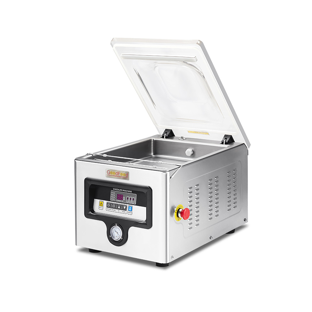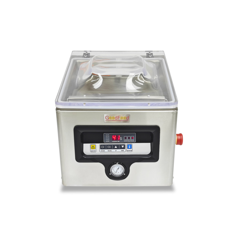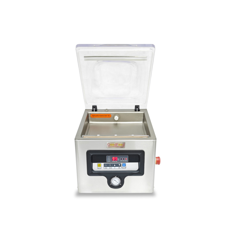 Якщо потрібно стабільно пакувати м’ясо, рибу, сири, соуси чи напівфабрикати, камерна система — найкращий вибір. Вакуумно-пакувальна машина GoodFood VMP260 забезпечує контрольований процес у закритій камері, герметичний шов та чисту роботу з продуктами, включно з рідинами та маринадами. Компактний настільний формат дає промислову якість навіть на обмеженій площі.