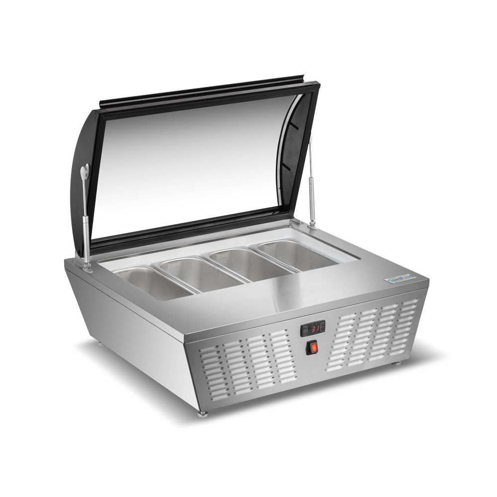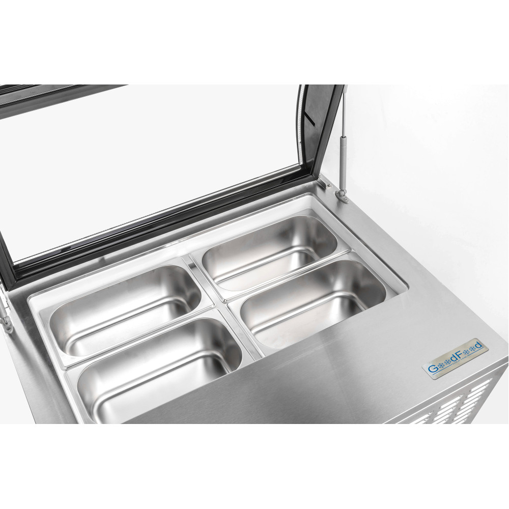 Вітрина для морозива GoodFood RTD67R забезпечує оптимальні умови зберігання та ефектну подачу десертів. Вигнуте скло підкреслює привабливість асортименту і захищає продукцію від зовнішніх впливів. Корпус із нержавіючої сталі гарантує тривалий термін служби та легке очищення. Цифрове управління дозволяє точно підтримувати температуру, а функція авторазморозки економить час персоналу. Завдяки універсальності гастроємностей ви зможете гнучко формувати асортимент.