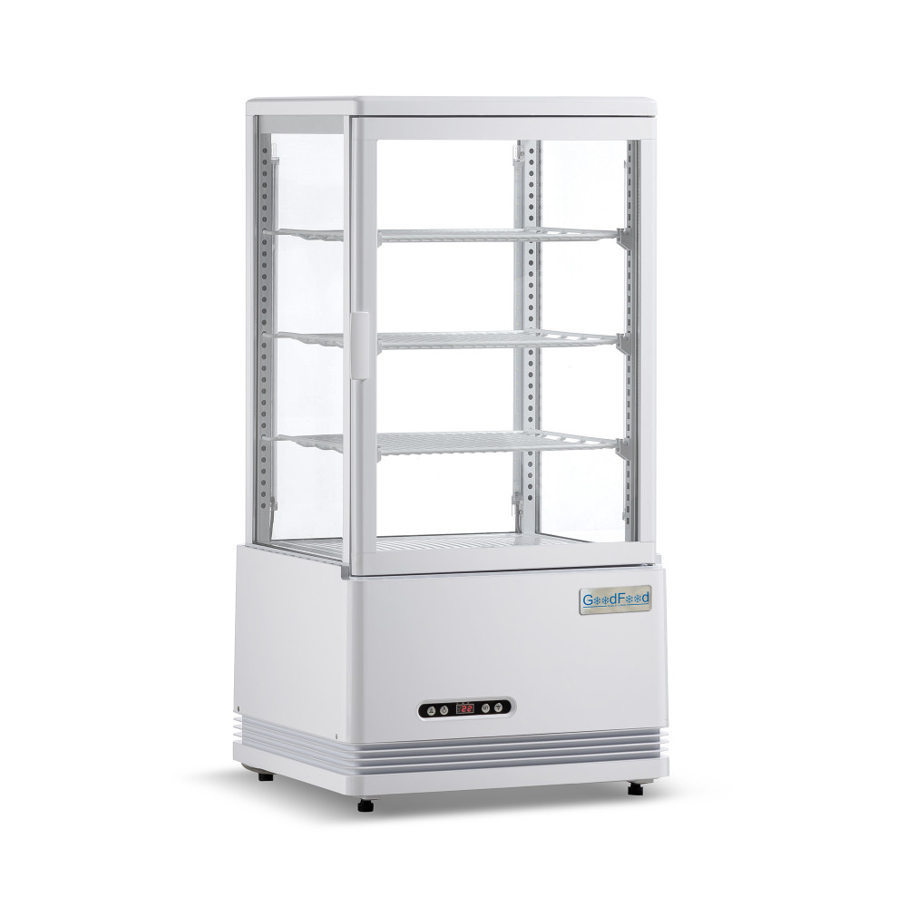 Вітрина холодильна GoodFood RT68L біла створена для ефектної викладки та стабільного охолодження десертів, напоїв і гастропродукції. Компактний корпус із панорамним оглядом з усіх боків одночасно притягує погляд покупця та підтримує товар у безпечному діапазоні. Робочий температурний режим 0…+12 °C, а термоконтролер дозволяє точно налаштувати +2…+6 °C для найбільш вимогливих позицій.