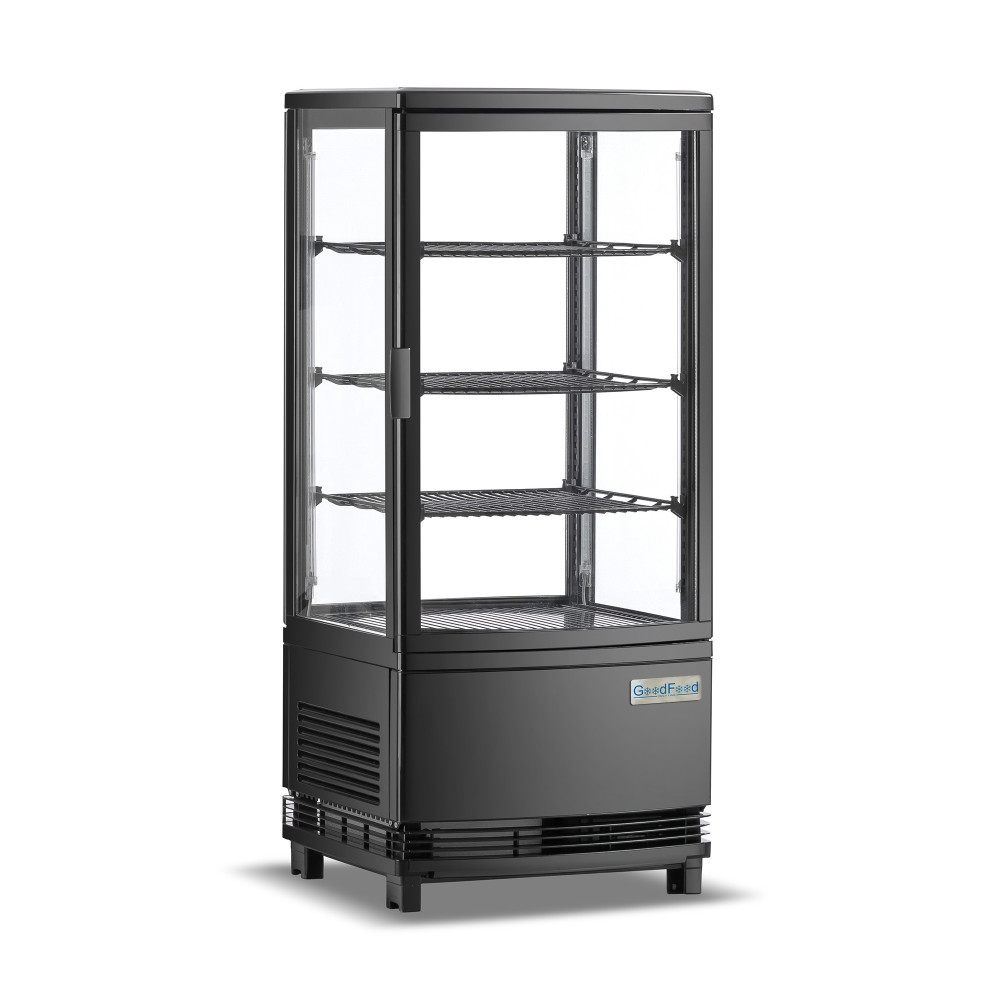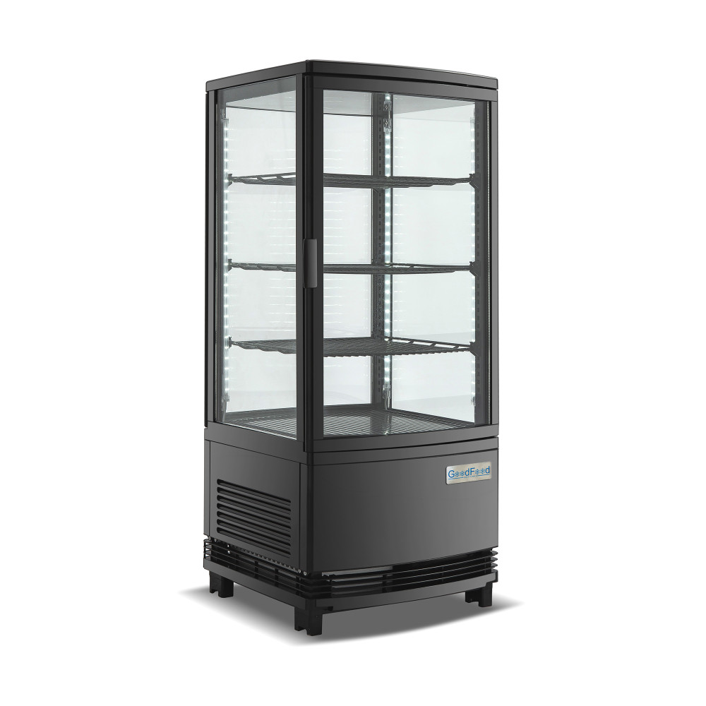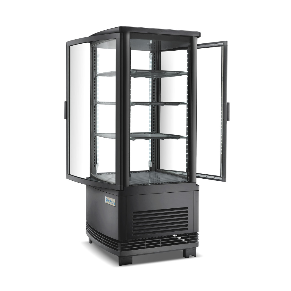 Вітрина холодильна GoodFood RT78LR2 чорна створена для ефектної подачі десертів, напоїв та гастрономії з повним оглядом і швидким доступом персоналу. Завдяки з двох сторін вітрини дверцятам і Двосторонньому боковому світлодіодному підсвічуванню товар виглядає апетитно, а обслуговування стає швидшим навіть у години пік.